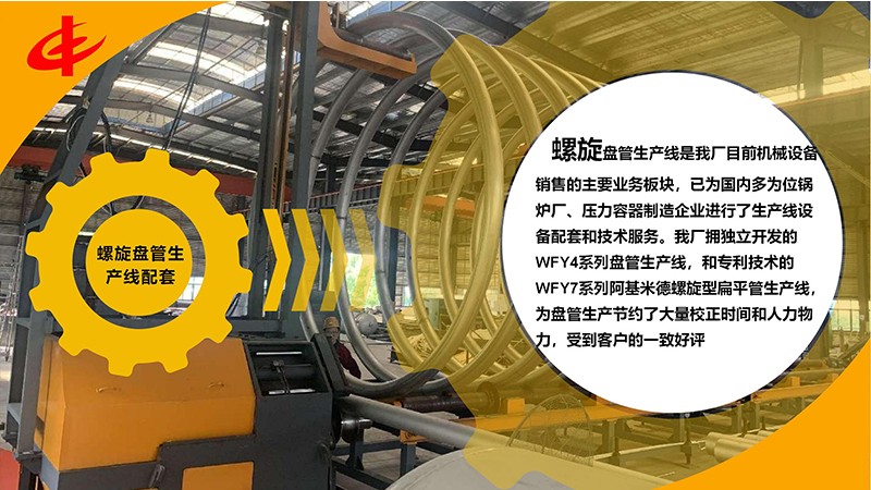 螺旋盤(pán)管生產(chǎn)線是我廠目前機(jī)械設(shè)備銷(xiāo)售的主要業(yè)務(wù)板塊,已為國(guó)內(nèi)多為位鍋爐廠、壓力容器制造企業(yè)進(jìn)行了生產(chǎn)線設(shè)備配套和技術(shù)服務(wù)。我廠擁獨(dú)立開(kāi)發(fā)的WFY4系列盤(pán)管生產(chǎn)線,和擁有專(zhuān)利技術(shù)的WFY7系列阿基米德螺旋型扁平管生產(chǎn)線,為盤(pán)管生產(chǎn)節(jié)約了大量校正時(shí)間和人力物力,受到客戶的一致好評(píng)。